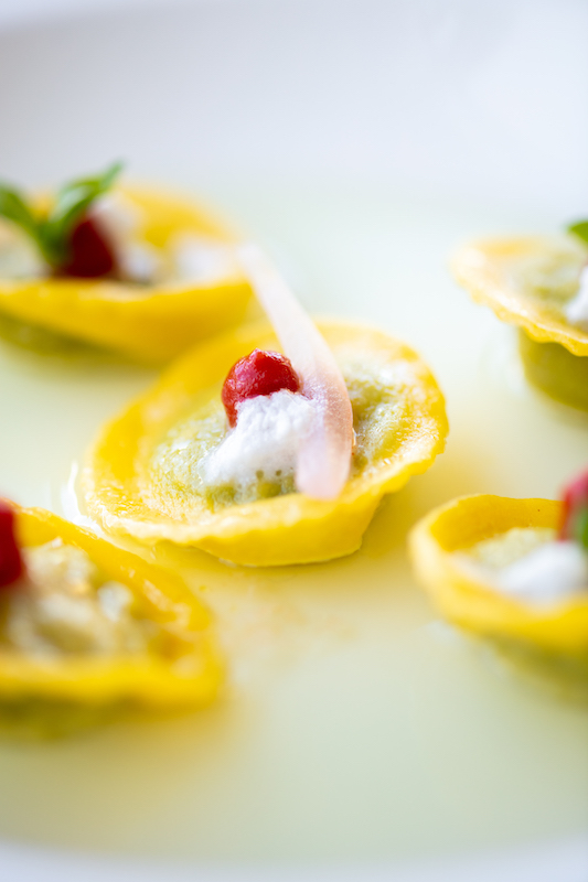 - Домашние равиоли с оливковым маслом и базиликом, подаются с томатным консоме и страчателлой