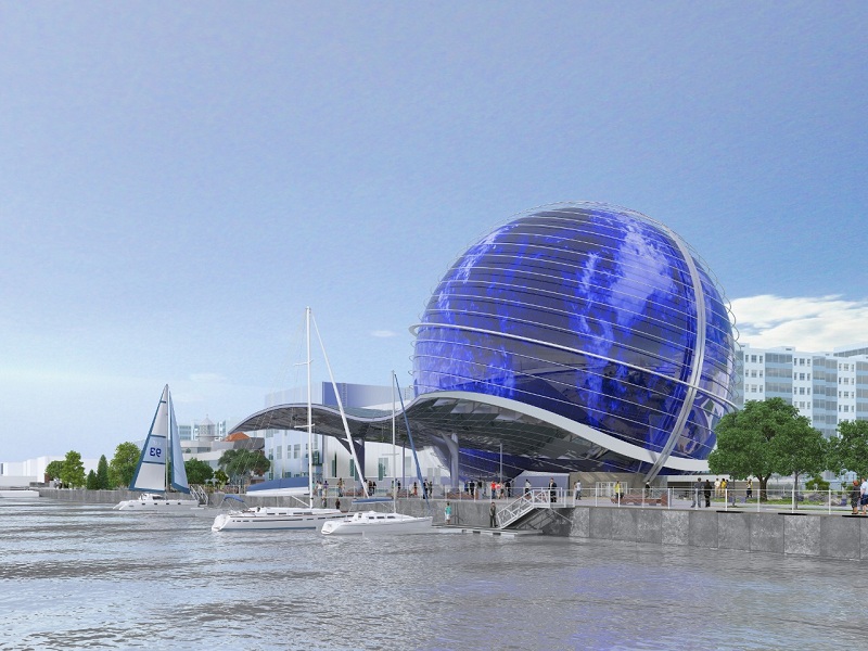 На набережной реки Преголя в Калининграде, более 150 рабочих и инженеров ведут строительство нового корпуса Музея Мирового океана. Архитектурной доминантой станет уникальное сооружение в виде шара, остекление которого состоит, из более чем 3-х тысяч сегментов. Внутри здания высотой 42 метра, расположатся более 30 аквариумов с морской водой общим весом около 1000 тонн. Над рекой возведут стилизованный под океанскую волну навес площадью более 2 тысяч кв. м.