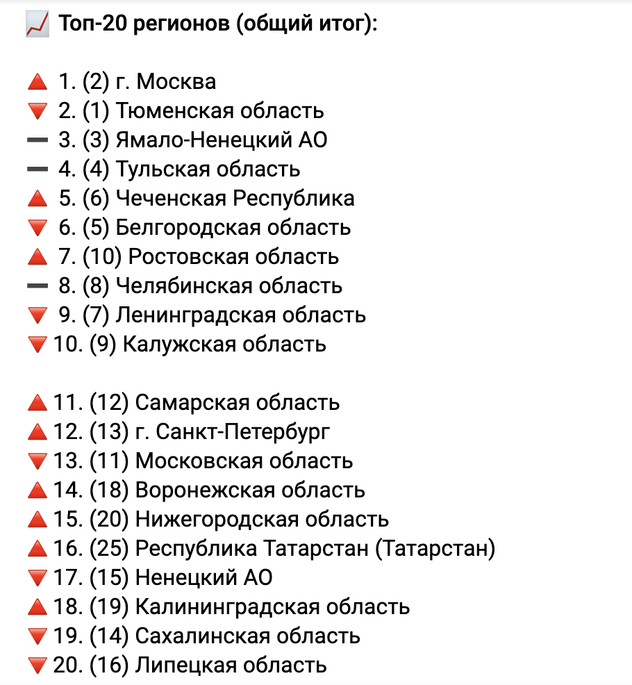 Результаты проведенного исследования наглядно демонстрируют, что в регионах общая эффективность управления несколько снизилась. Составители рейтинга на первое место поставили Москву. На второе место эксперты поставили Тюменскую область. Замыкает тройку Ямало-Ненецкий АО. Кроме того, в топ-20 попали, Тульская область, Чеченская Республика, Белгородская область, Ростовская область, Челябинская область, Ленинградская область, Калужская область, Самарская область, г. Санкт-Петербург, Московская область, Воронежская область, Нижегородская область, Республика Татарстан (Татарстан), Ненецкий АО, Калининградская область, Сахалинская область, Липецкая область.