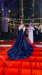 В платье цветов российского триколора по красной дорожке на DIAFA-2022 прошла предпринимательница из России