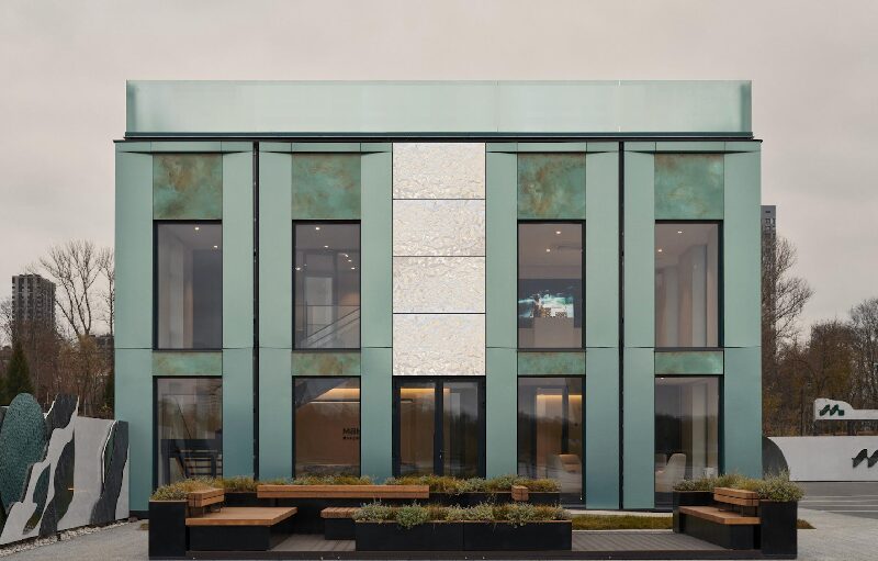 В основе концепции офиса продаж – образ спокойных речных вод, перекликающийся с концептуальным решением всего жилого проекта. В качестве основного материала были выбраны фасадные панели двух типов – моноцветные и с рисунком состаренной меди. Их дополнили металлическими вставками.