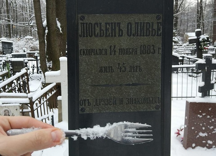 На могилу знаменитого кулинара Люсьена Оливье на Введенском кладбище начали приносить вилки в знак уважения к автору главного новогоднего салата России. Начало флешмобу положил Константин Максимюк — автор скандального клипа «Итоги года», который был снят на могиле Оливье (http://www.youtube.com/watch?v=xMhcraTYpOU).