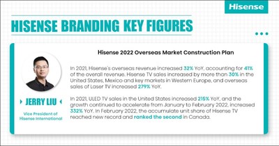 По данным исследований Ipsos за 2019-2021 годы, капитал бренда компании Hisense вырос на 54% за три года, а ее узнаваемость среди компаний 2B, специализирующихся на таких отраслях как умный дом, умный транспорт и умное медицинское обслуживание, вошла в число лучших в отрасли. Это означает, что глобальная узнаваемость бренда Hisense значительно выросла, что в то же время привело к росту продаж. В 2021 году продажи телевизоров Hisense в США, Мексике и крупных западноевропейских странах, таких как Великобритания, Франция и Германия, выросли более чем на 30%, а продажи лазерных телевизоров Hisense на зарубежных рынках за пределами КНР выросли более чем на 279% в годовом исчислении.