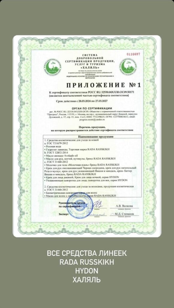 Специалистами были проверены и признаны соответствующими высоким стандартам все средства из линеек Rada Russkikh (косметика с инновационным составом и уникальными технологиями), HYDON (первая в России водородная косметика), MINI ME (средства на основе сыродавленных масел).