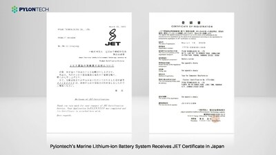 Компания Pylon Technologies Co., Ltd объявила 10 марта 2023 года о том, что ее морская литий-ионная аккумуляторная система получила сертификат JET в Японии. Этот сертификат, выдаваемый на основе стандартов JIS C 8715-2: 2019, стал очередным признаком признания компании Pylontech на японском рынке после того, как она получила сертификат на одноэлементный аккумулятор 37 Ач (модель: 37PN) и системы накопления энергии S-Mark of Force H2.