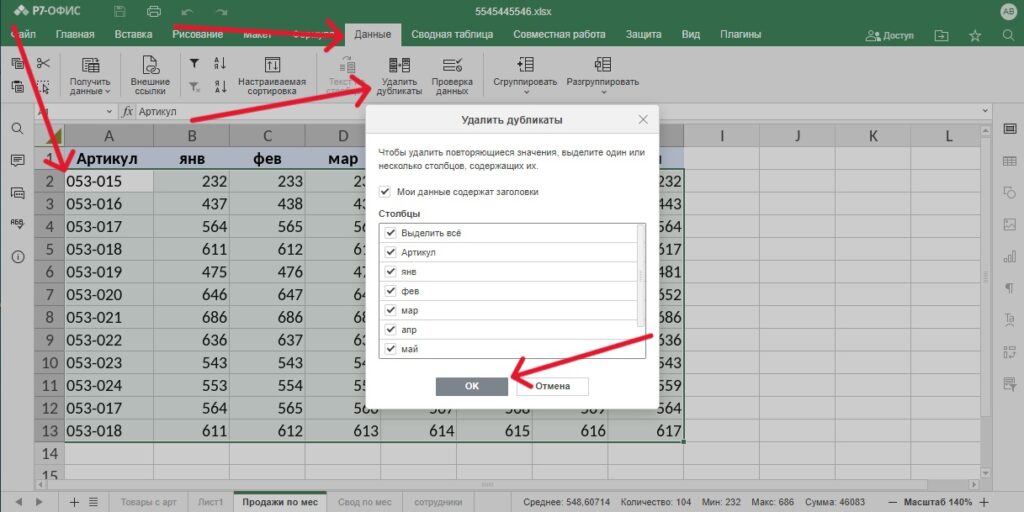 В таблице «Р7-Офис» можно автоматически удалить дубликаты. Эта опция полезна при работе с большими таблицами.