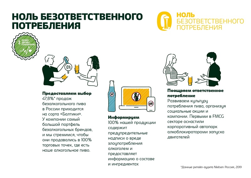- Ноль безответственного потребления. «Балтика» предоставляет потребителям широкий выбор безалкогольных напитков, обладая самым большим портфелем безалкогольных брендов в сегменте.