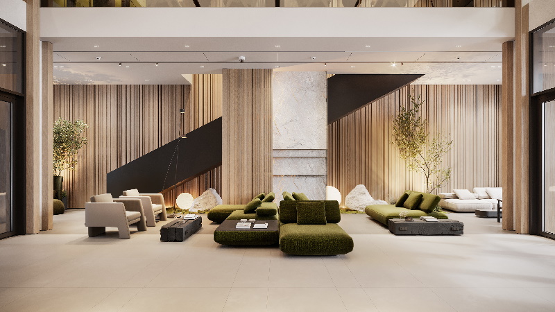 Светлое пространство с высокими потолками будет декорировано натуральными материалами. Для стен MORS ARCHITECTS предложили негорючие панели с фактурой дерева. Стойка ресепшен будет оформлена в фактуре натурального камня, и сама станет полноценным арт-объектом. Через все двухсветное пространство насквозь пройдут вертикальные пилоны в отделке под дерево, которые скроют монолитные колонны из бетона. Колонны и балки сформируют ощущение единого конструктива здания, будто созданного из огромных деревянных стоек. Интерьер лобби будет отчетливо просматриваться с улицы и задаст курортное, природное настроение пространству. Мягкие зоны будут решены в приглушенных молочном и травяном оттенках. Мягкая подсветка на разных уровнях поддержит сдержанное настроение интерьеров.