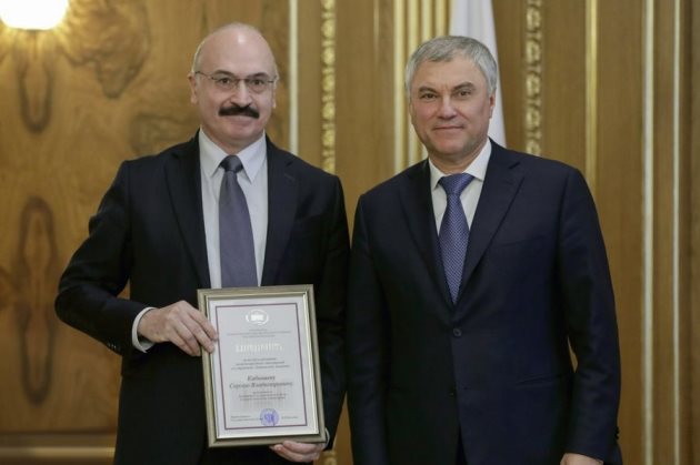 Депутат Госдумы, председатель комитета по науке и высшему образованию Сергей Кабышев получил благодарность от спикера Госдумы Вячеслава Володина