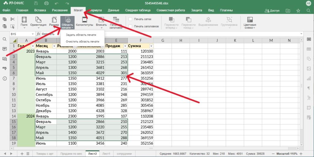 Затем следует в верхней панели инструментов перейти во вкладку «Макет», нажать на стрелку рядом с кнопкой «Область печати» и в выпадающем меню выбрать опцию «Задать область печати».