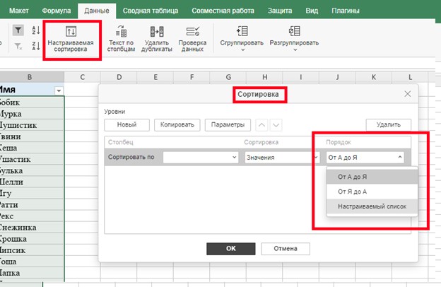 Для настройки специальной логики сортировки откройте вкладку «Данные» и выберите пункт «Настраиваемая сортировка». В открывшемся окне перейдите в раздел «Порядок», а затем в выпадающем меню выберите «Настраиваемый список». Этот список можно сохранить и использовать повторно, что особенно удобно.