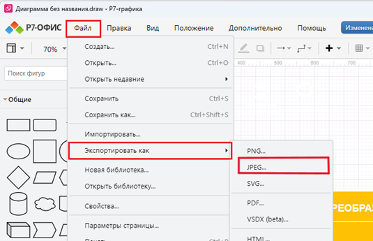 Вначале необходимо выделить диаграмму. Затем в верхней панели выбрать «Файл», после чего в выпадающем меню выбрать функцию «Экспортировать как», а в подменю — «JPEG».