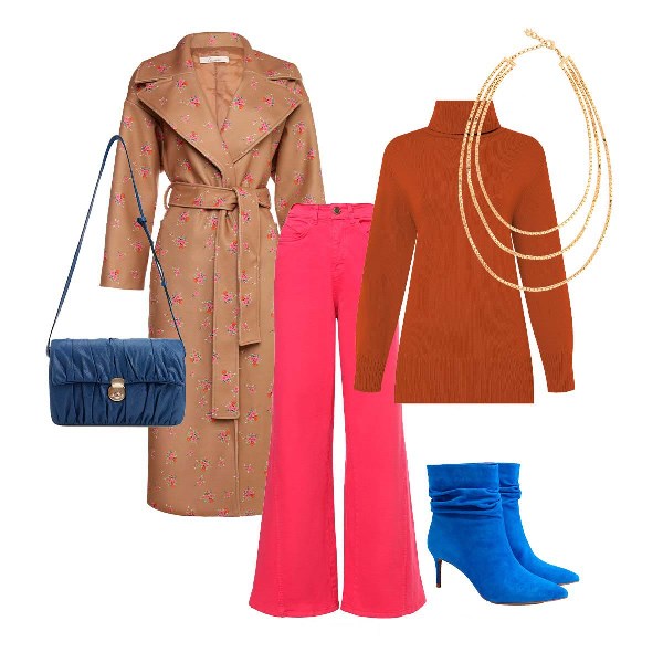 Образ для самого цветущего сезона может получится романтическим, но при этом смелым. Бежевое пальто в наивный цветочек с поясом и отвернутым воротником сделает аутфит воздушным и нежным. Под него отлично подходит однотонный свитер с высоким горлом яркого цвета. Например, это может быть сочный оранжевый оттенок Tangelo, который признан институтом Pantone трендовым цветом теплого сезона 2023 года. Добавляем к нему ярко-розовые джинсы-трубы, которые подчеркнут любой тип фигуры, и замшевые ярко-синие ботильоны на тонком каблуке, чтобы вытянуть силуэт и визуально удлинить ноги. Такое сложное сочетание цветов позволяет даже без дополнительных украшений создать достаточно заметный и законченный лук.