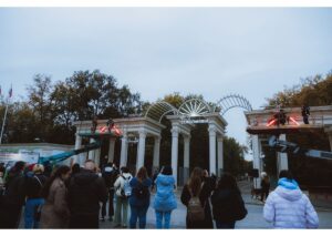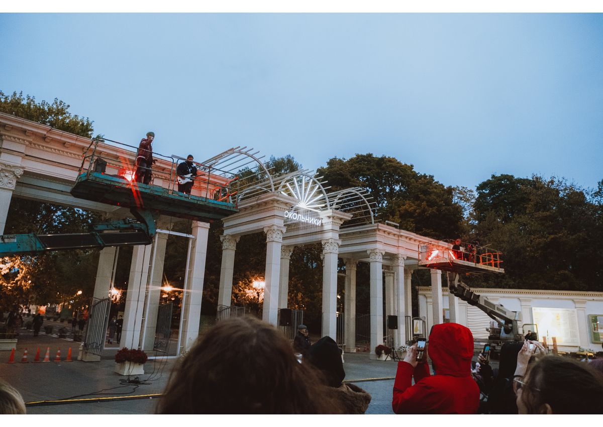 Коллектив устроил необычный перформанс на входе в парк, использовав строительные автовышки для подъема на высоту.